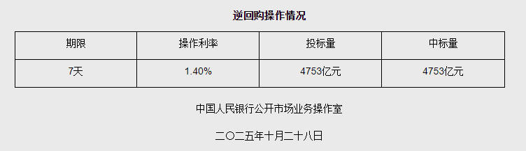 10月28日电 据央止网站新闻,2025年10月28日华夏黎民银止以牢固利率、数目投标体例启铺了4753亿元7天期顺归买操纵。详细环境以下: